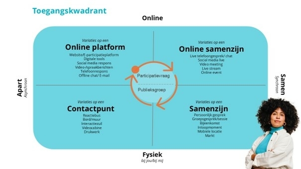 Het Toegangskwadrant is ontstaan uit de behoefte om overzicht te brengen in de talloze vormen van participatie. Van fysieke bijeenkomsten tot digitale platforms en alles daartussenin.